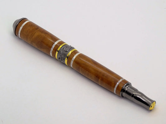 Broadwell Nouveau Sceptre Fountain Pen in Gunmetal, Gold, Madrone Burl, Mother of Pearl Inlay